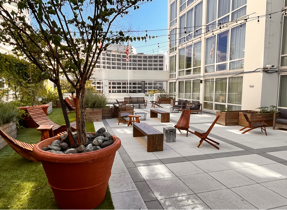 Great location Bunk bed style rooms for tour groups Onsite parking Natural light for event space Roof top w/Pool Bicycles on site Peloton in fitness center
