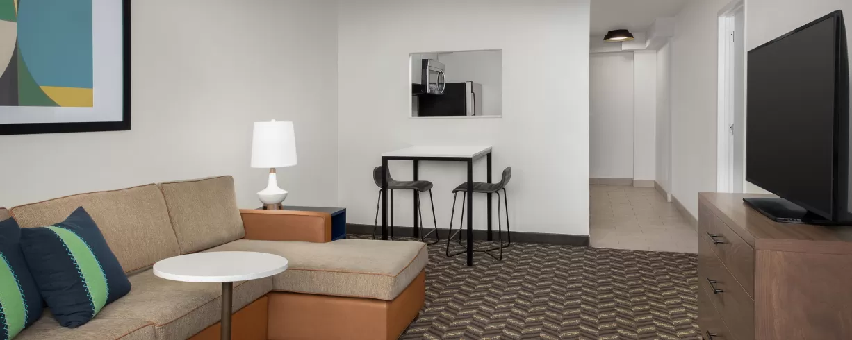 Enjoy spacious residential-style suites with full kitchens and pull-out sofas, plus free Wi-Fi and flat-screen TVs. Start your day with complimentary hot breakfast, and take advantage of our 24-hour fitness center, guest laundry, and grocery delivery. Whether you're here for a few days or a few months, we make it easy to feel at home.