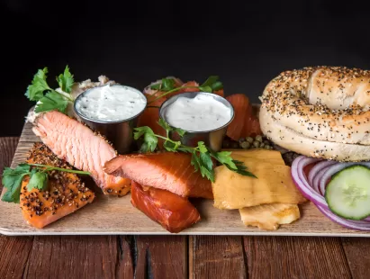 Perfect for casual office, social, or holiday gatherings. The menu changes based on the season. Cocktails, beer, and wine are available.